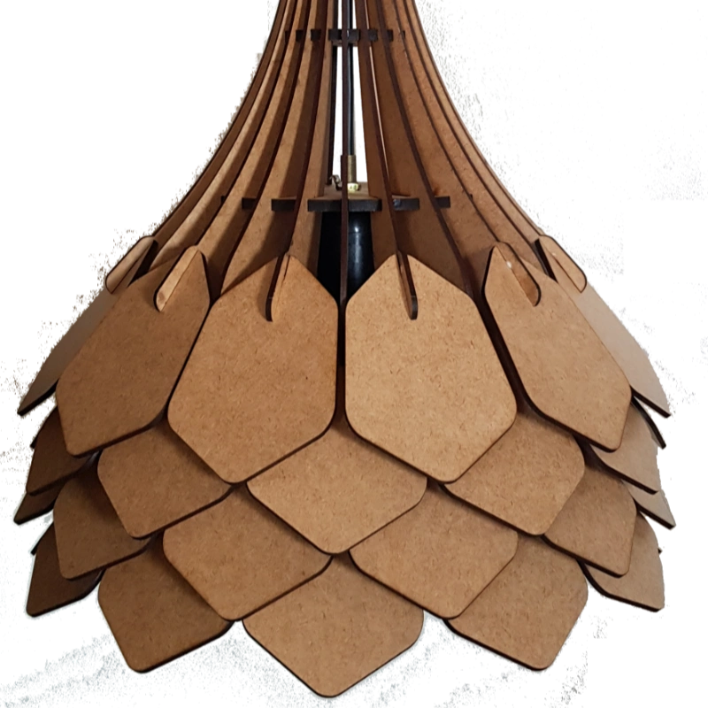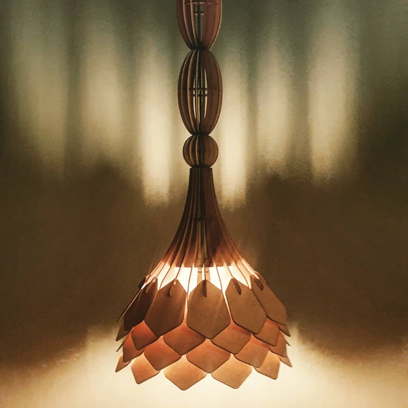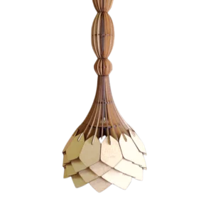 The Arty Pendant looks like an upended flower. It is a unique design and is approximately 300mm in height and width. The ‘stem’ can be lengthened by adding oblong or round, wooden ‘beads’. Please contact us directly via email or WhatsApp for sizes and prices of the beads.