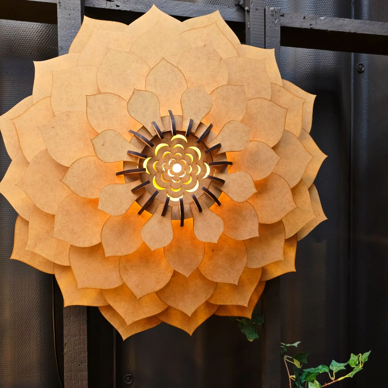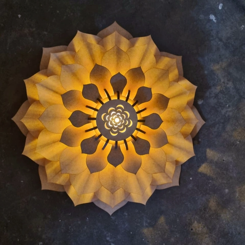 The Lotus Ceiling Light is a radiant centrepiece inspired by the elegance of nature. Shaped like a blooming flower, its layered petals unfold in luminous harmony, casting a warm golden glow that enriches the atmosphere of any room. Intricate cut‑outs at the centre enhance the play of light, creating the impression of a glowing blossom suspended gracefully from above. Versatile in design, the Lotus can be installed as a ceiling pendant or mounted as a wall light, offering both beauty and adaptability. More than illumination, it is a sculptural statement that brings softness, warmth, and a touch of poetry to your space.
